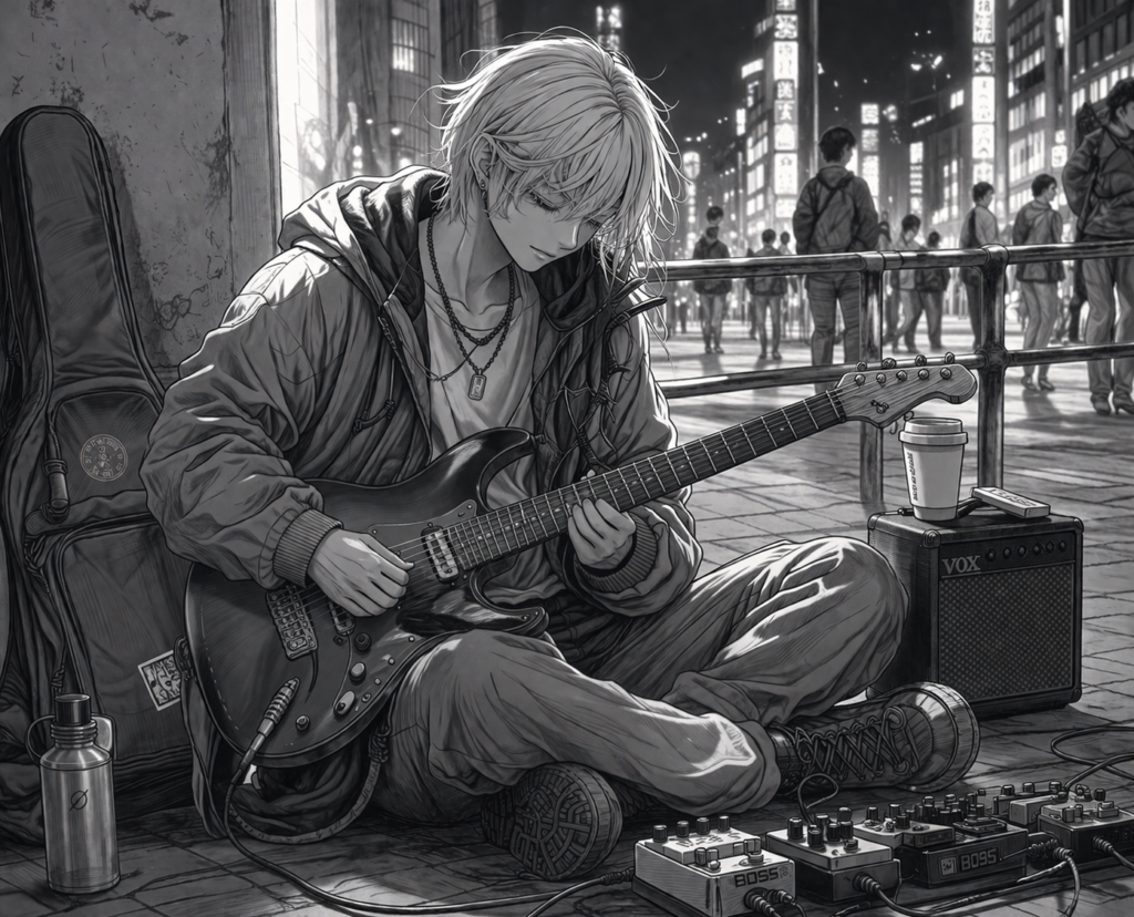 黒っぽいギターを抱えて、路上の喧噪に押し潰されるでもなく、